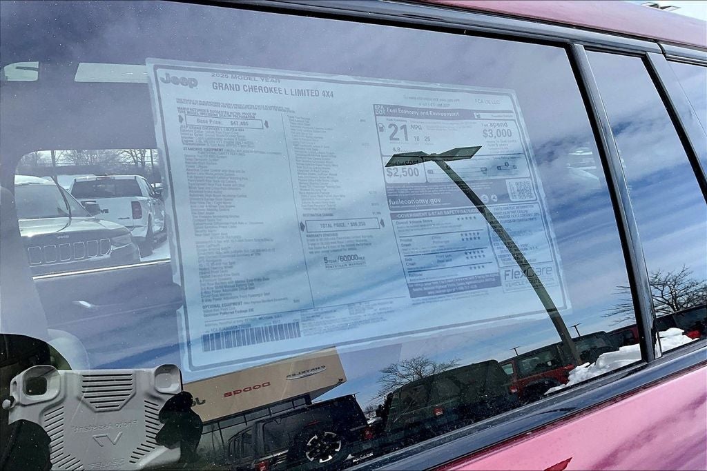 2025 Jeep Grand Cherokee L 4D Sport Utility 4WD Black Appearance Package (Gloss Black Exterior Accents and Wheels: 20 x 8.5 Gloss Black Painted Aluminum), Luxury Tech Group II (2nd Row Manual Window Shades, Auto-Dimming Exterior Driver Mirror, Capri Leatherette with Axis II Seats, Integrated Off-Road Camera, Intersection Collision Assist System, Memory Steering Column, ParkSense Front/Rear Park Assist with Stop, Passive Entry - Front/Rear Doors, Liftgate, Power Tilt/Telescope Steering Column, Rain Sensitive Windshield Wipers, Rear Back Up Camera Washer, Rearview Autodim Digital Display Mirror, Surround View Camera System, Ventilated Front Seats, and Wireless Charging Pad), Quick Order Package 23E, Trailer Tow Package (220 Amp Alternator, 7 and 4 Pin Wiring Harness, Automatic Headlamp Leveling System, Class IV Receiver Hitch, Dual Exhaust Tips, Heavy-Duty Engine Cooling, Rear Load Leveling Suspension, and Trailer Hitch Zoom), 3.45 Rear Axle Ratio, 3rd row seats: split-bench, 4-Wheel Disc Brakes, 6 Speakers, ABS brakes, Active Noise Control System, Air Conditioning, Alloy wheels, AM/FM radio: SiriusXM with 360L, Anti-whiplash front head restraints, Audio memory, Auto High-beam Headlights, Automatic temperature control, Brake assist, Bumpers: body-color, Capri Leatherette Seats, Compass, Delay-off headlights, Driver door bin, Driver vanity mirror, Dual front impact airbags, Dual front side impact airbags, Dual-Pane Panoramic Sunroof, Electronic Stability Control, Emergency communication system, Four wheel independent suspension, Front anti-roll bar, Front Bucket Seats, Front Center Armrest w/Storage, Front dual zone A/C, Front fog lights, Front License Plate Bracket, Front reading lights, Fully automatic headlights, Garage door transmitter, Heated door mirrors, Heated front seats, Heated rear seats, Heated steering wheel, Illuminated entry, Interior Rear Facing Camera, Knee airbag, Low tire pressure warning, Manual Fold Seatbacks, Memory seat, Model Year Tracking, Navigation System, Normal Duty Suspension, Occupant sensing airbag, Outside temperature display, Overhead airbag, Overhead console, Panic alarm, ParkView Rear Back-Up Camera, Passenger door bin, Passenger vanity mirror, Power door mirrors, Power driver seat, Power Liftgate, Power passenger seat, Power steering, Power windows, Radio data system, Radio: Uconnect 5 Nav with 10.1 Display, Rear air conditioning, Rear anti-roll bar, Rear reading lights, Rear window defroster, Rear window wiper, Reclining 3rd row seat, Remote keyless entry, Security system, Speed control, Speed-Sensitive Wipers, Split folding rear seat, Spoiler, Steering wheel mounted audio controls, Tachometer, Telescoping steering wheel, Tilt steering wheel, Traction control, Trip computer, Turn signal indicator mirrors, Variably intermittent wipers, Voltmeter, and Wheels: 18 x 8.0 Polished/Painted Aluminum *** Priced below KBB Fair Purchase Price ***