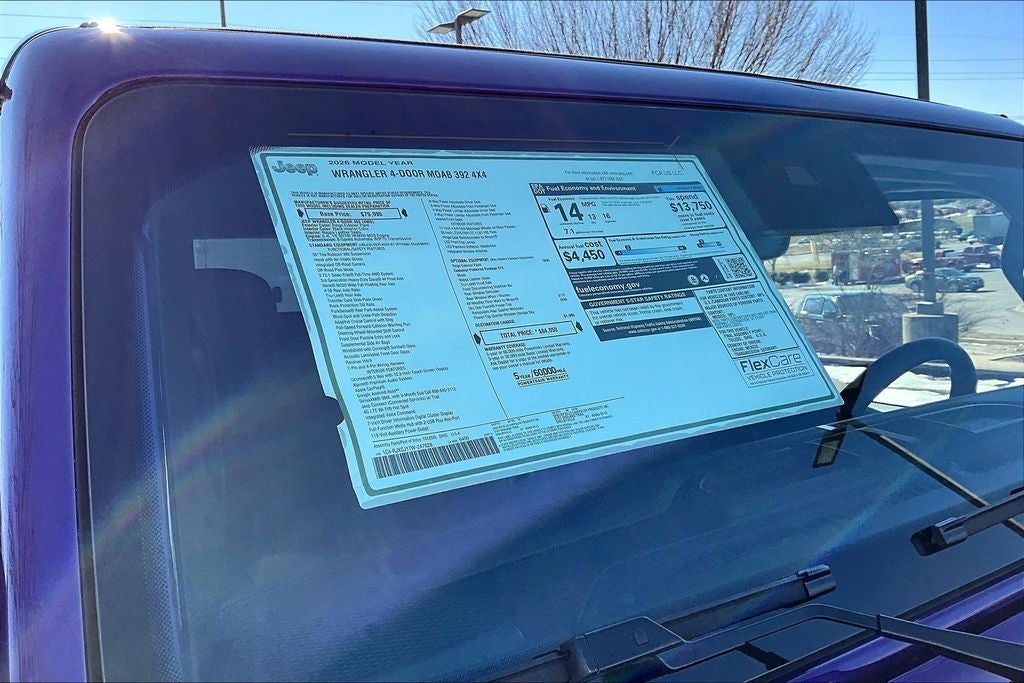 2026 Jeep Wrangler 4D Sport Utility 4WD Quick Order Package 27X Moab (E-Locker Front Axle, Freedom Panel Storage Bag, Front Disconnecting Stabilizer Bar, Nappa Leather Seats, Rear Window Defroster, and Rear Window Wiper/Washer), 12.3 Touchscreen Display, 35 Tire Rubicon 392 Suspension, 4-Wheel Disc Brakes, 4.56 Rear Axle Ratio, 4G LTE Wi-Fi Hot Spot, 9 Speakers, ABS brakes, Air Conditioning, Alloy wheels, AM/FM radio: SiriusXM with 360L, Apple CarPlay, Apple CarPlay/Android Auto, Auto-dimming Rear-View mirror, Automatic temperature control, Aux Battery, Auxiliary Switches, Brake assist, Class II Receiver Hitch, Compass, Connectivity - US/Canada, Delay-off headlights, Driver door bin, Driver vanity mirror, Dual front impact airbags, Dual front side impact airbags, Electronic Stability Control, Emergency communication system: Jeep Connect, For More Info, Call 800-643-2112, Front anti-roll bar, Front Bucket Seats, Front Center Armrest w/Storage, Front dual zone A/C, Front fog lights, Front License Plate Bracket, Front reading lights, Fully automatic headlights, Garage door transmitter, Glass rear window, Google Android Auto, Heated door mirrors, Heated front seats, Heated steering wheel, Illuminated entry, Integrated Center Stack Radio, Integrated roll-over protection, Leather Shift Knob, Leather steering wheel, Low tire pressure warning, MOPAR All-Weather Floor Mats, Navigation System, Non-Lock Fuel Cap w/o Discriminator, Occupant sensing airbag, Outside temperature display, Overhead airbag, Panic alarm, ParkView Rear Back-Up Camera, Passenger door bin, Passenger vanity mirror, Power door mirrors, Power driver seat, Power passenger seat, Power steering, Power Top Quarter Window Storage Bag, Power windows, Radio data system, Radio: Uconnect 5 Nav w/12.3 Display, Rear anti-roll bar, Rear reading lights, Rear seat center armrest, Rear window defroster, Rear window wiper, Remote keyless entry, Removable Rear Quarter Windows, Security system, SiriusXM Radio Service, SiriusXM w/360L, Sky One-Touch Power Top, Speed control, Split folding rear seat, Sport steering wheel, Steering wheel mounted audio controls, Stop-Start Dual Battery System, Tachometer, Telescoping steering wheel, Tilt steering wheel, Traction control, Trip computer, Variably intermittent wipers, Voltmeter, and Wheels: 17 x 8 Machined w/Black Pockets *** Priced below KBB Fair Purchase Price ***