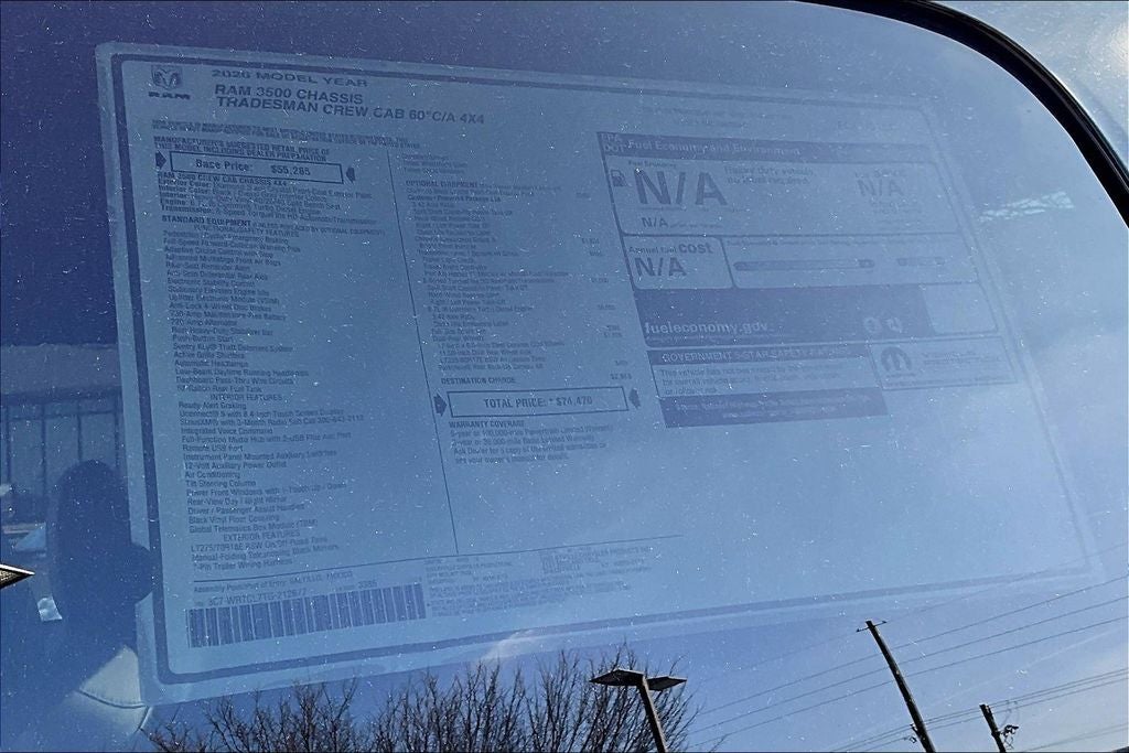 2026 Ram 3500 4D Crew Cab 4WD Chrome Appearance Group A (Bright Front Bumper, Bright Wheel Skins, Center Hub, Chrome Grille Surround, and Matte Black Mesh Grille with Chrome), Quick Order Package 25A Tradesman, Tradesman Level 1 Equipment Group (Black Exterior Mirrors, Black Power Heated Fold Telescope Mirrors, Exterior Mirrors Courtesy Lamps, Exterior Mirrors with Heating Element, Exterior Mirrors with Supplemental Signals, Manual Folding Exterior Mirrors, Manual Telescoping Mirrors, Mirror Running Lights, Power Adjust Mirrors, Power-Adjustable Convex Aux Mirrors, Rear Window Defroster, Trailer Brake Control, and Trailer Light Check), 11.50 Dual Wheels Rear Axle, 2 Way Rear Headrest Seat, 4-Wheel Disc Brakes, 40/20/40 Split Bench Seat, 4G LTE Wi-Fi Hot Spot, 6 Speakers, 6000# Front Axle with Hub Extension, ABS brakes, Air Conditioning, AM/FM radio: SiriusXM, Apple CarPlay, Apple CarPlay/Android Auto, Black Wheel Center Hub, Compass, Connectivity - US/Canada, Delay-off headlights, Driver door bin, Dual front impact airbags, Dual Rear Wheels, Electronic Stability Control, Emergency communication system: RAM Connect, For Details, Visit DriveUconnect.com, Front anti-roll bar, Front Armrest with Cupholders, Front Center Armrest w/Storage, Front fog lights, Front License Plate Bracket, Front reading lights, Fully automatic headlights, Global Telematics Box Module, Google Android Auto, GPS Antenna Input, HD Vinyl 40/20/40 Split Bench Seat, Illuminated entry, Integrated Voice Command with Bluetooth®, Manual Adjust 4-Way Driver Seat, Manual Adjust 4-Way Front Passenger Seat, Nexen Brand Tires, Occupant sensing airbag, Outside temperature display, Overhead console, Panic alarm, ParkView Rear Back-Up Camera, Passenger door bin, Passenger vanity mirror, Power steering, Power windows, Radio data system, Radio: Uconnect 5 with 8.4 Display, Rear anti-roll bar, Rear Folding Seat, Remote keyless entry, Remote USB Port - Charge Only, Speed control, Storage Tray, Tachometer, Temperature and Compass Gauge, Tilt steering wheel, Traction control, Variably intermittent wipers, Voltmeter, Wheels: 17 x 6.0 Steel Chrome Clad, Wheels: 18 x 8.0 Polished Aluminum, and Wheels: 18 x 8.0 Steel Painted *** Priced below KBB Fair Purchase Price ***
